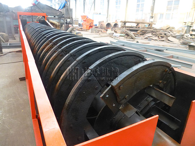 螺旋洗砂機工作時,電機通過三角帶、減速機、齒輪減速后帶動葉輪緩慢轉動,砂石由給料槽進入洗槽中,螺旋洗砂機在葉輪的帶動下翻滾,并互相研磨,除去覆蓋砂石表面的雜質,同時破壞包覆砂粒的水汽層,以利于脫水;同時加水,形成強大水流,及時將雜質及比重小的異物帶走完成清洗作用。